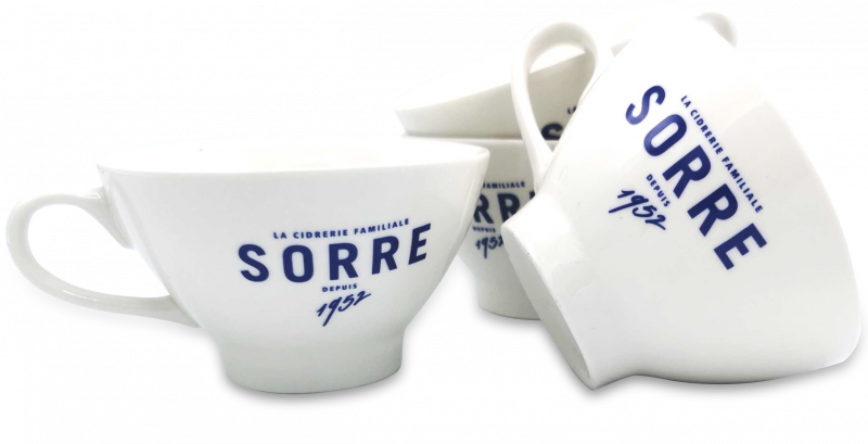 Jolies bolées blanches à anse à l'effigie de la cidrerie SORRE. Lot de 6 bolées.