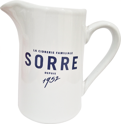 Pichet blanc à anse dentelée, à l'effigie de la cidrerie SORRE. Vente à l'unité.